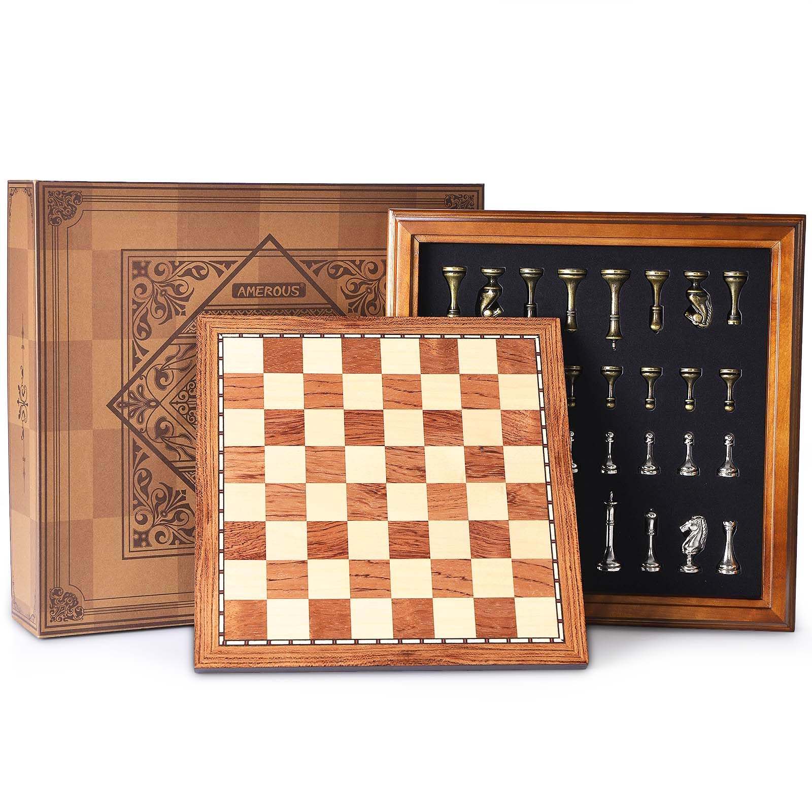 AMEROUS Wooden Chess Board Set 12.5 Inch with Metal Pieces Storage for Adults and Kids Unique Tournament Game for Beginners and Professionals