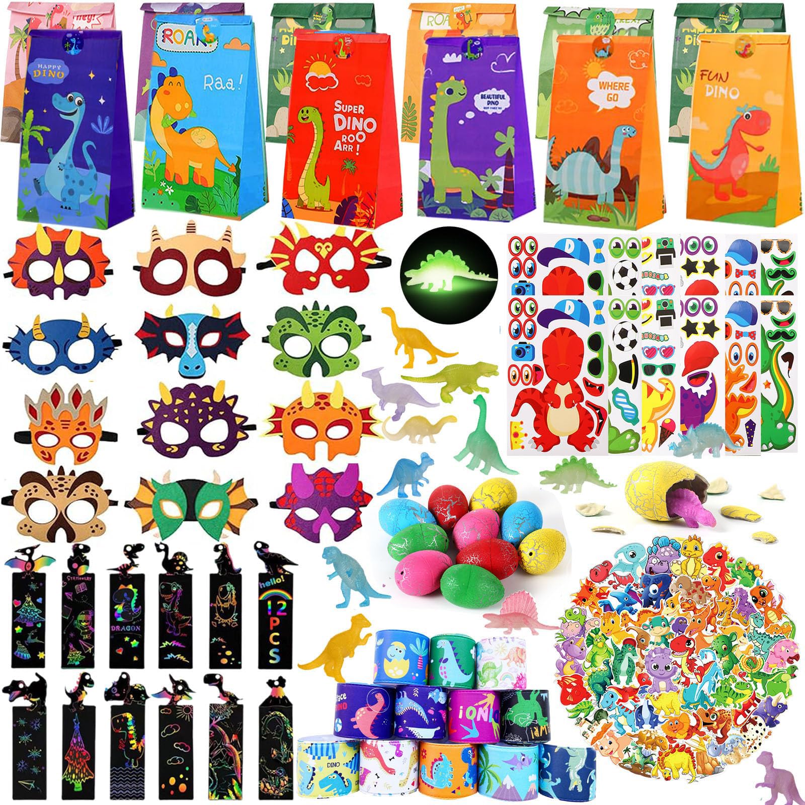 - ✓DINOSAUR PARTY FAVORS TOYS 156pcs 12 Dinosaur Masks 12 Slap Bracelets 60 Dinosaur Stickers 12 Make a Dinosaur Face Stickers 12 Little Dino Figures 12 Dinosaur Stickers 12 Dinosaur Paper Goodie Gifts Bags 12 Dinosaur Thanks Stickers 12 Dinosaur Eggs Toys12