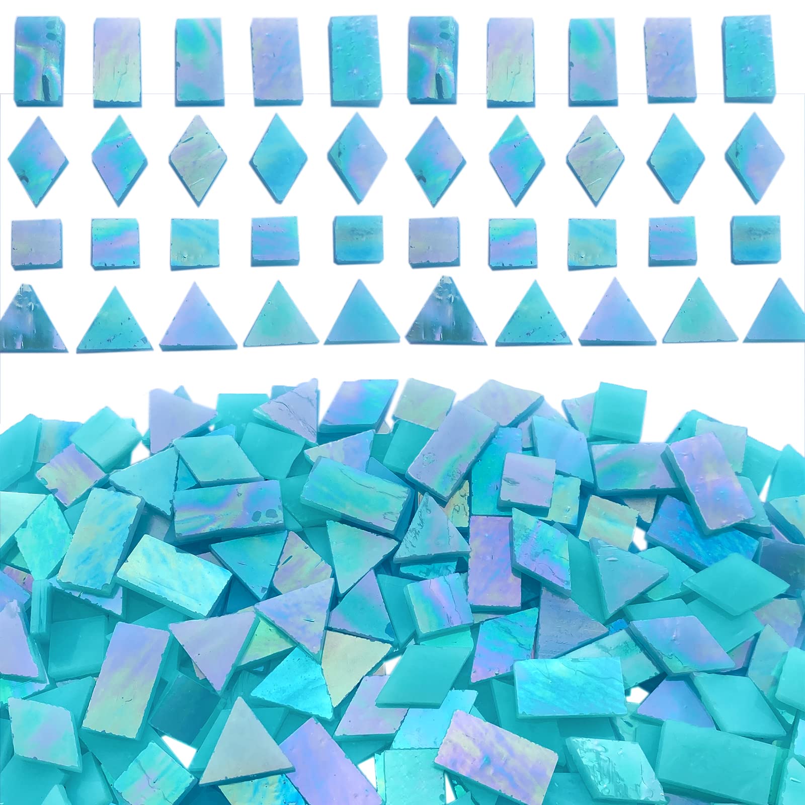 KALUCION Iridescent Aqua Stained Glass Mosaic Tiles 280 Pieces Mixed Shapes for Creative Mosaic Projects
