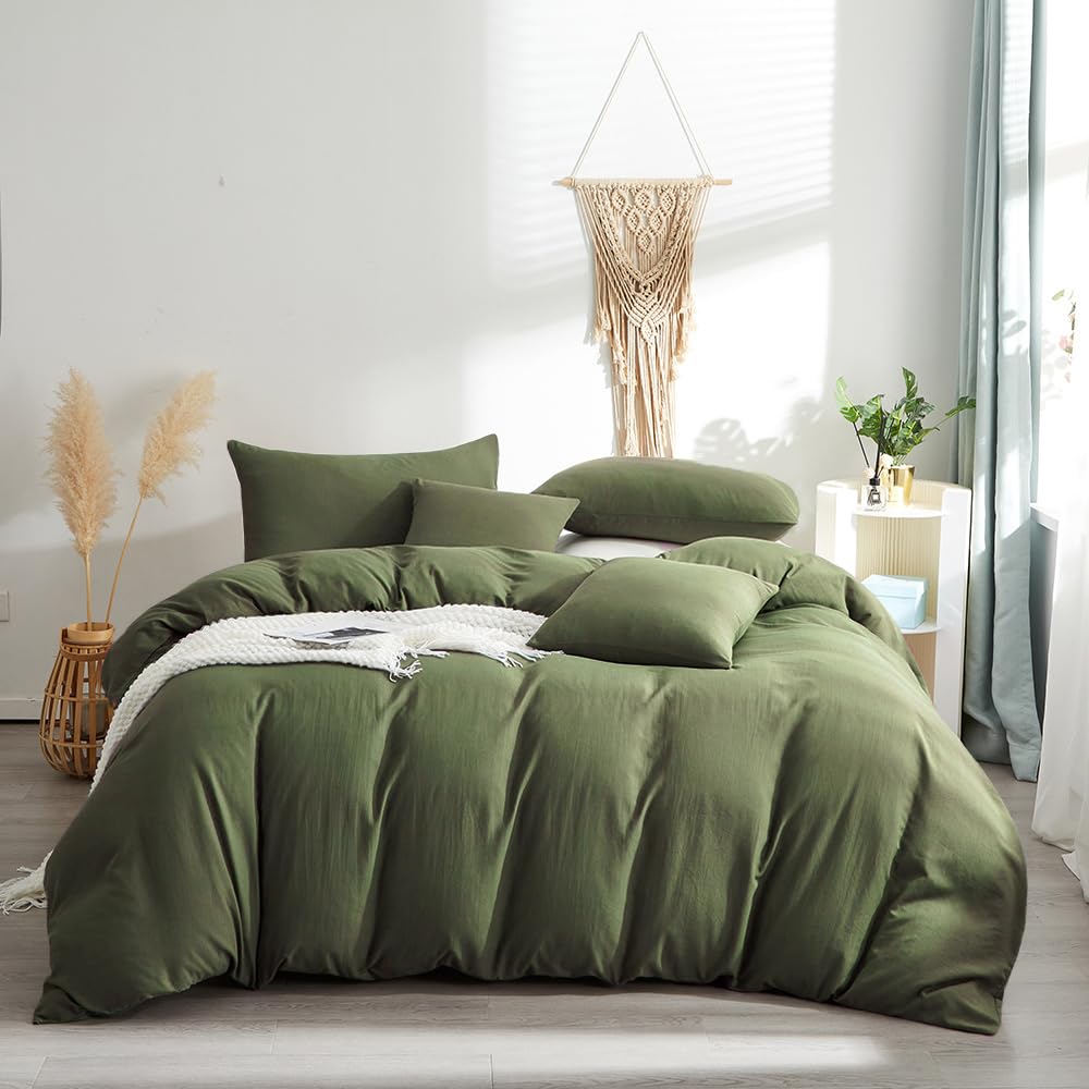 Wellboo Olive Green Comforter Set Queen Size Soft Cozy Cotton Bedding Modern Minimalist Dark Green Quilts for Women and Men